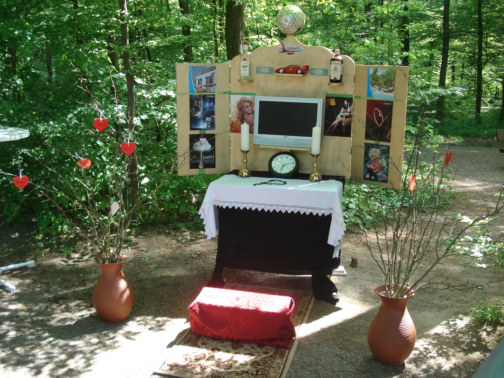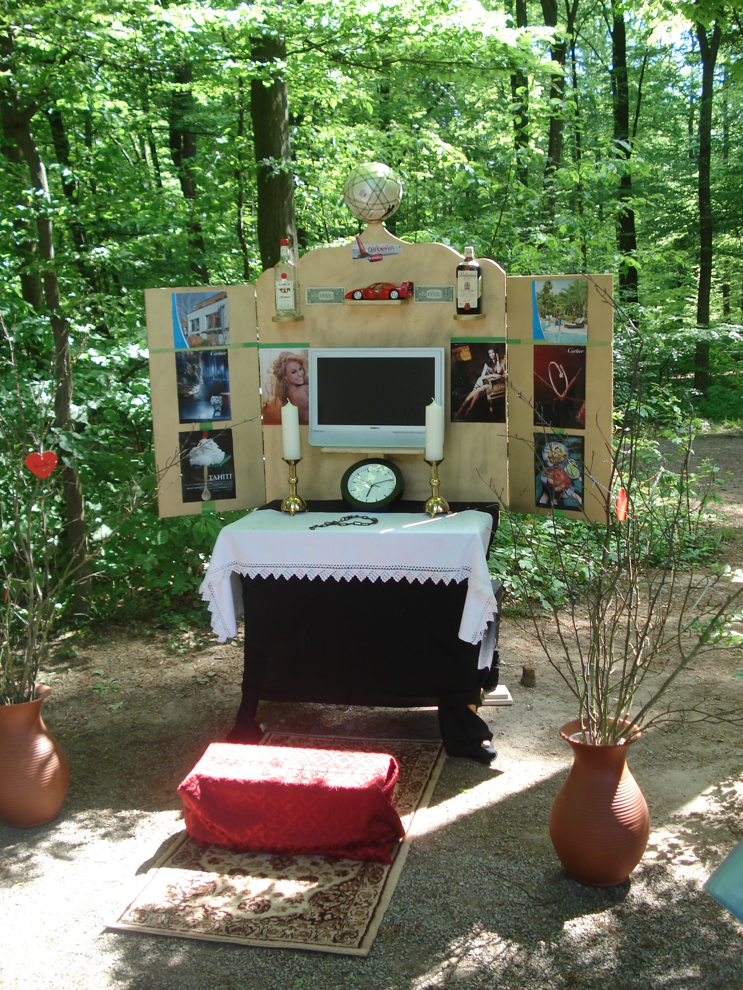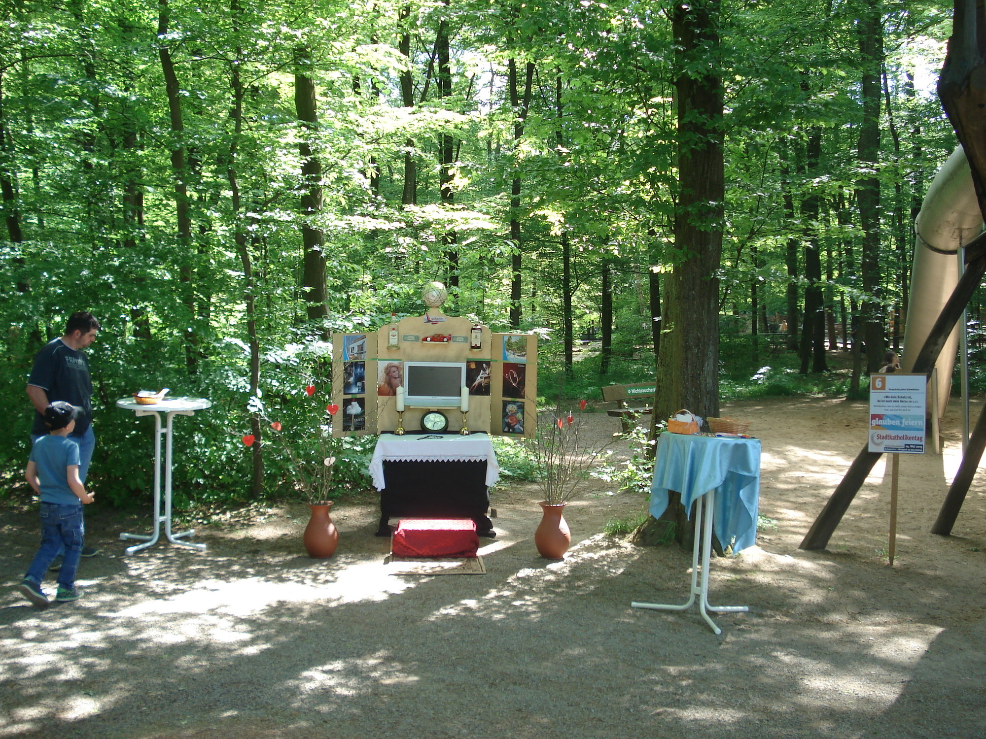 "Bei strahlendem Sonnenschein fanden an Christi Himmelfahrt weit mehr als tausend Christen den Weg in den Schweinfurter Wildpark an den Eichen. Dort feierten alle gemeinsam den Stadtkatholikentag. Viele Helferinnen und Helfer haben ein buntes Programm auf die Beine gestellt. Die Begeisterung am Glauben war den ganzen Tag zu spüren." - So lautet der Textvorspann des Bistum-TV, das in einem kleinen Film die Ereignisse zusammenfasst: http://bistum-tv.de/videos/132-fuenfter-stadtkatholikentag-2015-in-schweinfurt. Einer der 30 dargebotenen workshops wurde von den MitarbeiterInnen des GesprächsLadens verantwortet. Unter dem Motto "Wo euer Schatz ist, da ist auch euer Herz" (Mt 6,21) hatten die Teammitglieder in tatkräftiger Zusammenarbeit einen "Anbetungsaltar" der ganz anderen Art gestaltet - u.a. bestückt mit einem Fußball, mit erotischen Fotos, einem schnellem Sportwagen, einem Fernseher, den Bildern von Urlaubsreisen, Schmuck, einer Villa... provokativ, karikierend präsentiert: Lauter Momente also, an die Menschen heute gerne ihr Herz hängen, dabei übersehend, dass es unklug ist, "Schätze auf Erden" zu sammeln, wo sie Motten und Rost fressen, und wo Diebe einbrechen und stehlen. Besser ist es "Schätze im Himmel" zu sammeln (vgl. dazu: Mt 6, 19f.). - Manche der Vorübergehenden betrachteten den von uns gestalteten "Altar" interessiert, neugierig, zustimmend, andere zeigten sich irritiert, ratlos, mit kritischem Blick. In der Regel entwickelten sich schnell intensive Gespräche, die halfen, aufzuklären, zu verstehen, persönliche Bezüge herzustellen. Viele BesucherInnen nahmen die Einladung gern an, aufzuschreiben, woran ihr Herz wirklich hängt. So kamen am Ende über 200 rote Papier-Herzen zusammen, die wirklich Wichtiges und "Anbetungswürdiges" widergaben wie: Meine Familie, die Gesundheit meines Mannes, mein Hund Butsch, Gott und alles, was mich glücklich macht, mein Glaube, meine Mama u.v.m.