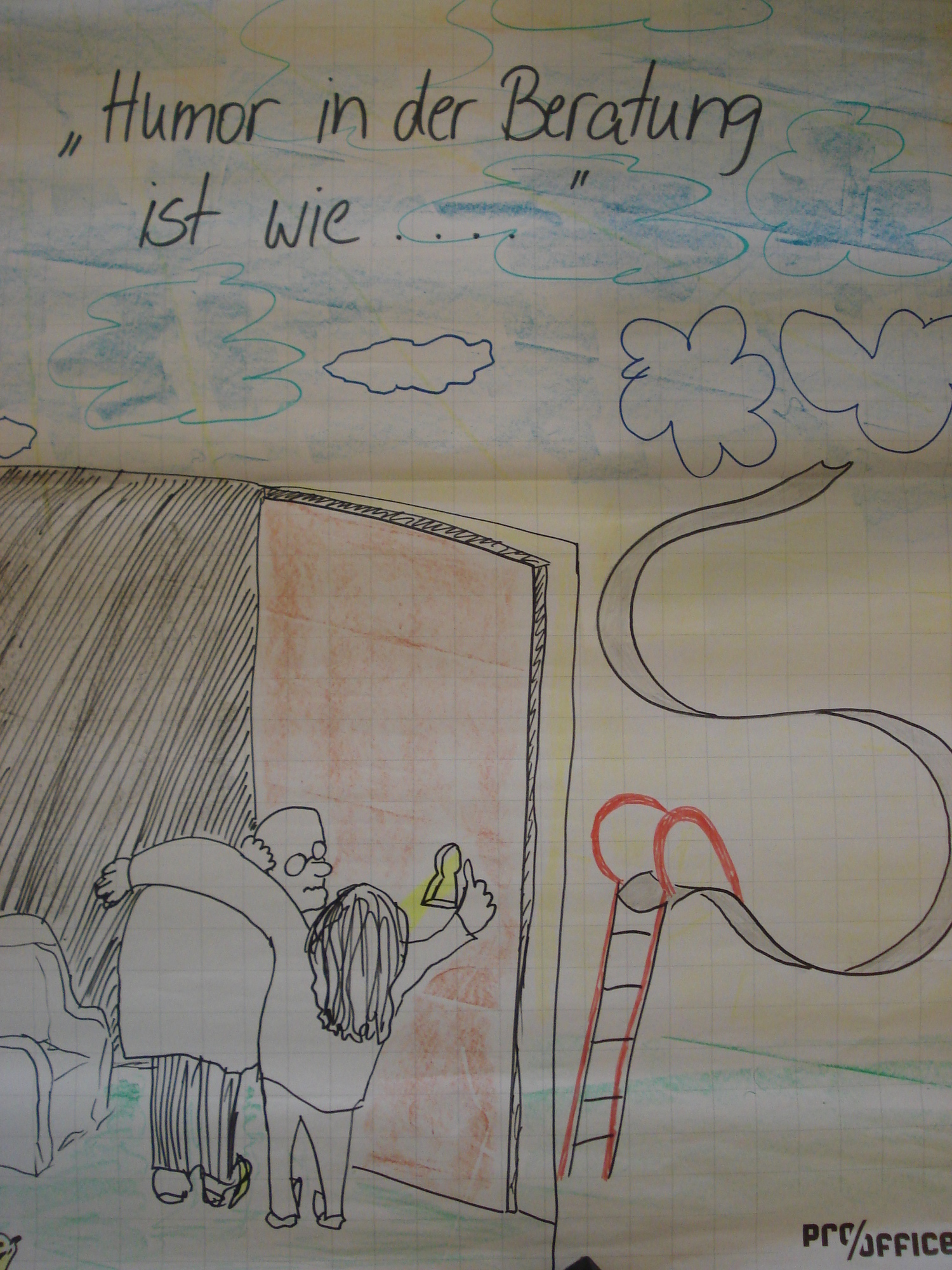 Bei der diesjährigen Bundeskonferenz der "Offenen Türen", zu denen der GesprächsLaden Schweinfurt gehört, wurde unsere Einrichtung durch unsere ehrenamtliche Mitarbeiterin Gabi vertreten. Gastgeber war diesmal die Bahnhofkirche in Zürich, Tagungsort: Kappel. Schwerpunktmäßig beschäftigten sich die Kolleginnen und Kollegen mit dem Thema "Humor in der Beratung" unter kompetenter Anleitung von Esther Arnold, dipl. systemischer Coach, Beraterin und Trainerin (ECA). Humor ist zweifellos eine wunderbare, unverzichtbare Ressource. Spielerische Sprachbilder, gemeinsames Lachen, sich selber und den anderen nicht immer so ganz ernst nehmen ... solche Momente geben der Begegnung eine besondere Würze und ermöglichen sehr oft überraschende Lösungen. Es erleichtert und schenkt Hoffnung, neben die Deutung des "Schweren" noch eine zweite Deutung des "Leichteren" zu stellen und manchmal die skurrile, originelle, verrückte, lustige Seite einer Problematik "vorsichtig aufzugreifen"...
