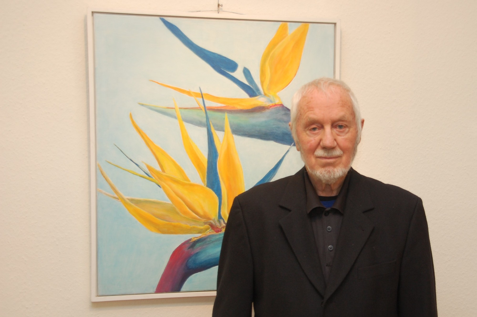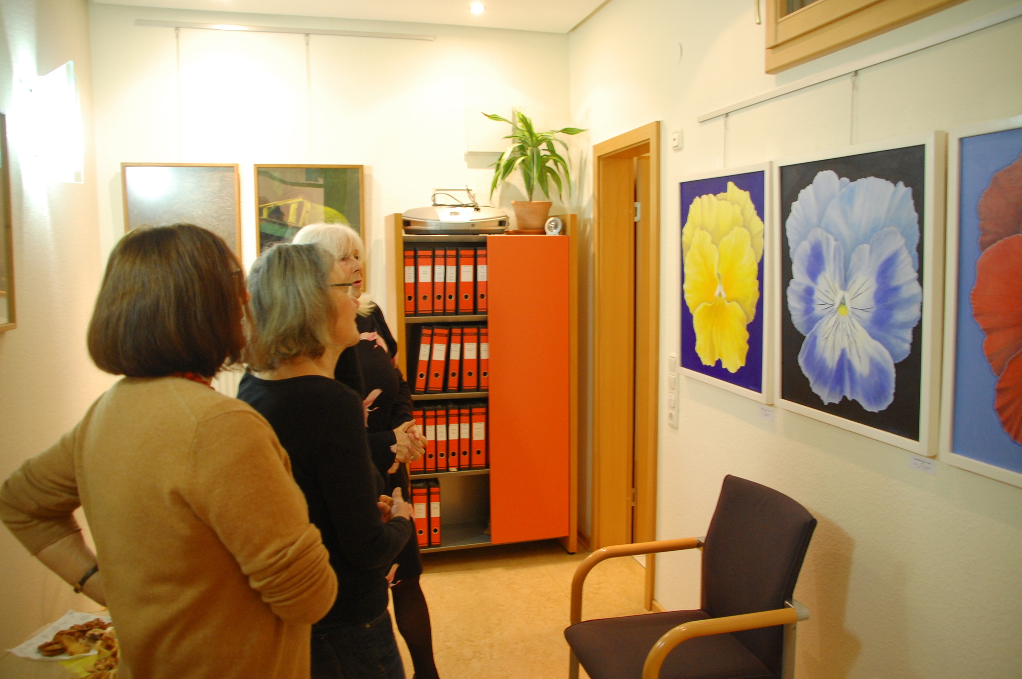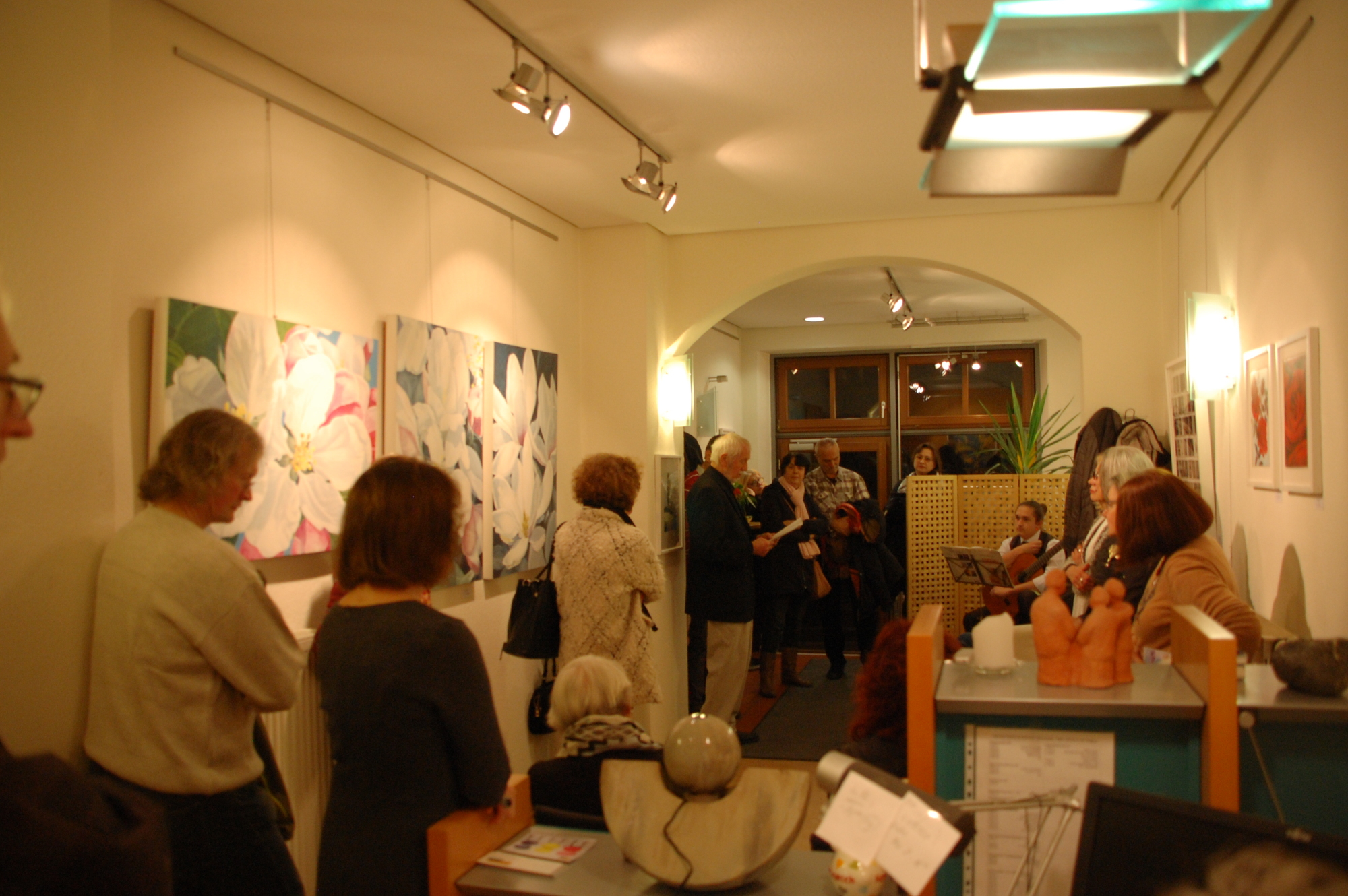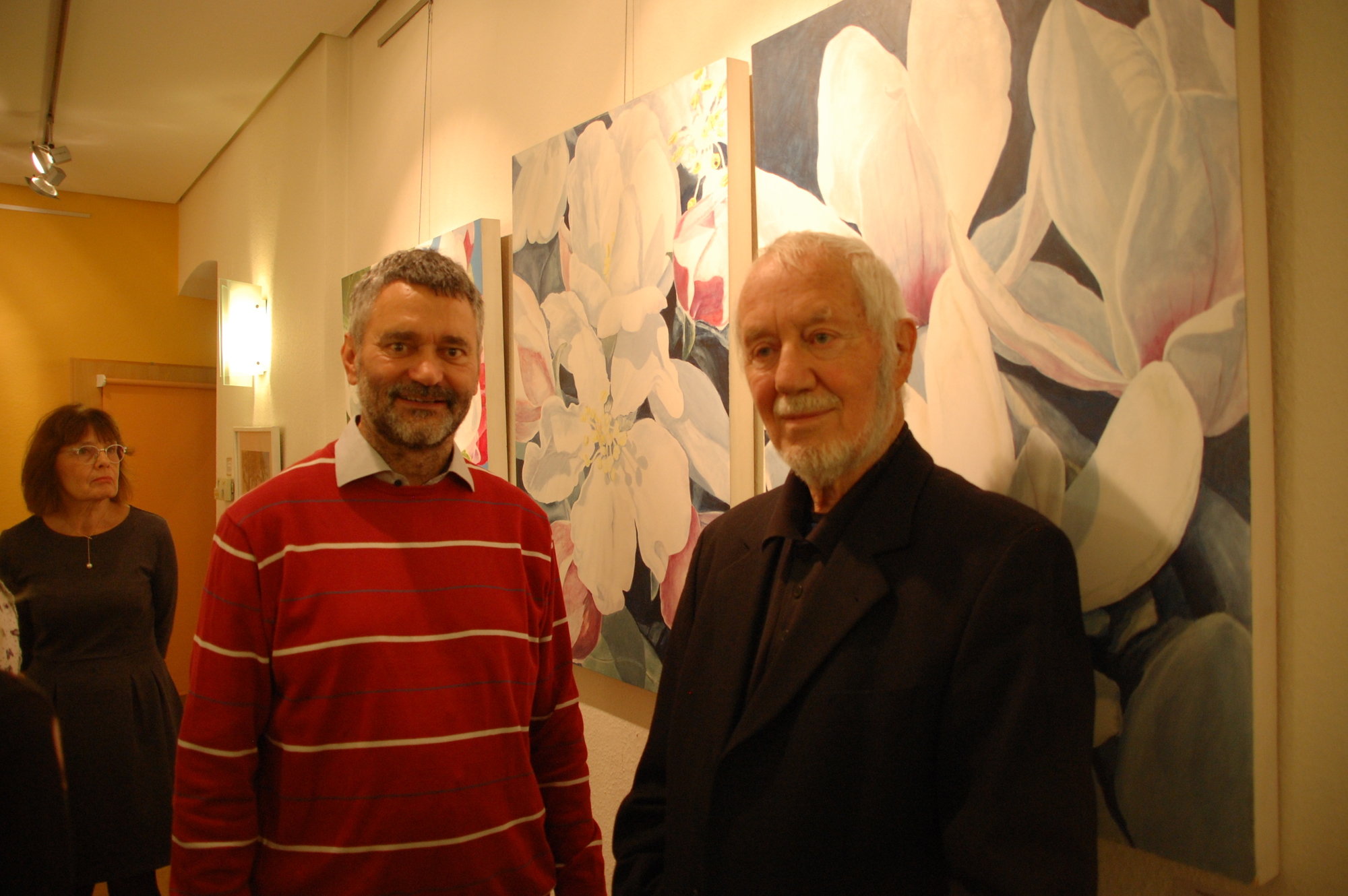 Etwa 30 Personen kamen zur Ausstellungseröffnung am Freitag, den 22. November, um die Bilder von Lothar Fersch (88) zum Thema "Lieblingsmotiv: Blumen" anzuschauen und gemeinsam eine unterhaltsame, vergnügliche Abendstunde zu verbringen. Zu Beginn zitierte Robert Bundschuh, der Leiter des GesprächsLadens, Franz Grillparzer: "Ein Ochs ging auf die Wiese, wo er nach Kräften fraß. Da waren Blumen, Kräuter, es kümmerte ihn nicht weiter. Für ihn war alles Gras!" - und sagte daran anschließend: "Manchmal benehmen sich Menschen wie dieser Ochse. Sie übersehen die Schönheit der Blumen am Wegrand, rupften sie gedankenlos. Ganz anders Lothar Fersch; er kann bestimmt keiner Blume etwas zuleide tun; er schaut sie an, gibt ihnen im Malen ihren Wert, ihre Würde, ihre Schönheit. Diese achtsame Betrachtungsweise kann inspirieren, ebenso zu handeln!" Anschließend zitierte Bundschuh eine Reihe von Redewendungen und Sprichwörtern, die es im Zusammenhang mit Blumen gibt wie "auf Rosen gebettet" oder "Blumen sind die schönen Worte und Hieroglyphen der Natur, mit denen sie uns andeutet, wie lieb sie uns hat" (Johann Wolfgang von Goethe). Lothar Fersch erzählte von seinem künstlerischen Wertegang, wie er zum Malen kam, welche Lern- und Erfahrungsorte es bei ihm gab... und von seiner Leidenschaft für den eigenen Garten zu Hause, der ihn sehr erfülle.