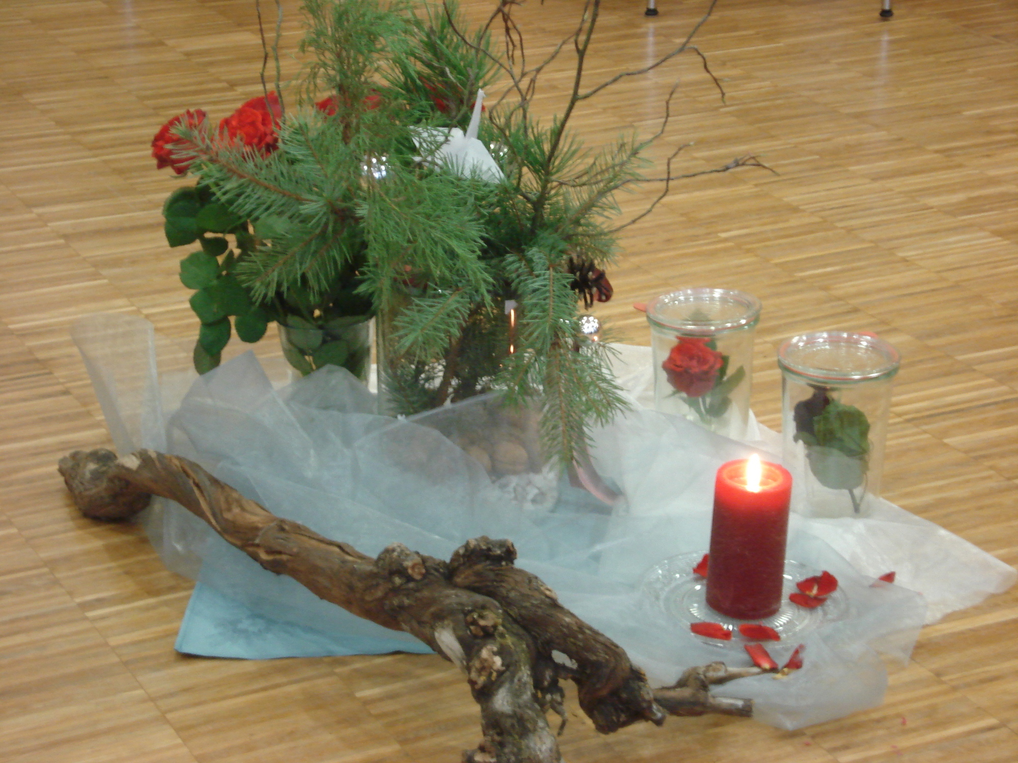 Auf dem Foto (Gestaltung der Kreismitte) sind zwei "Einmachgläser" abgebildet, je mit einer frischen bzw. verdorrten Rose innen drinnen: ein Impuls zur Frage: Was macht Liebe haltbar?